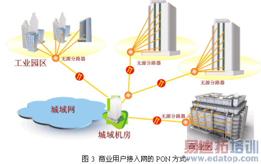 如果采用PON的方式进行组网,就可以完全解决该运营商的难题。如图3所示,采用PON的方式组网,可将光纤直接拉到最终用户,为今后的业务开展提供坚实的网络基础。另外,PON将使用无源光分路器实现多个用户的业务收敛,替代原来的远端机房,大大节省建设投资和运维投资。