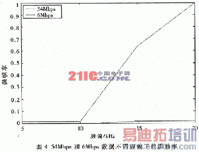 100byte的长度在802.11a系统中属于较小的帧长度,在这种情况下,当频偏达到15kHz的6Mbps也受到了影响,而54Mbps的数据在15kHz时,由于频偏造成的误帧率高达64%,而20kHz的频偏可使几乎所有的54Mbps的数据帧都发生错误。可见,频偏对802.11a系统的影响是相当大的。