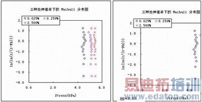 式中σp为光纤筛选应变,通常为1%(单位无);σr为光纤使用过程中所产生的应变(相对拉长,单位无));Fr为光纤断裂概率(单位无);L0为光缆线路中光纤总长度(单位公里);Mp为光纤筛选每公里平均断裂次数;n为光纤的疲劳参数(可用动态疲劳参数代替,单位无);m为光纤断裂强度韦伯尔分布曲线斜率(单位无);tp为光纤出厂时加力筛选的持续时间(单位秒);tr为光纤的估算寿命(单位年)一般n一20,σp/σr—4,光纤使用寿命可达30年以上,当然这个值与要求的光纤发生断裂的概率值Fr有关,Fr越小,光纤寿命期越长。同样,光纤的Nd值越大光纤的寿命也就越长,同时还可以降低对光缆的抗拉强度的要求,进而降低光缆的成本。中天光纤为海底光缆研发的高强度大盘长光纤,其典型的三种不同拉伸速率下的Weibull分布和Nd值图如下: