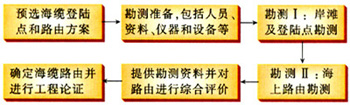 海缆路由调查是海缆系统工程设计和工程建设的基础,需先对岸滩地形、地貌、地物的现场进行察看,走访海洋、航道、地质、水文、航运、渔业、海产养殖、建设规划、军事及通信等部门,收集与海缆工程有关的各方面资料,进行比较分析,初步确定出海缆登陆点和路由方案;然后采用先进的技术手段和设备进行海缆路由勘测,以便选择安全、可靠的海缆登陆点和路由,确定出经济合理的敷设海缆技术方案,确保海缆通信的安全稳定;最后根据勘察确定出路由,并选用相应的光缆和施工方式进行施工布放。