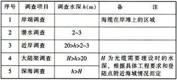 按所调查的不同海水深度划分海缆路由所需调查的项目,具体如表1所示。