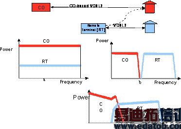 如上图2给出了一种常见的VDSL2部署方案,并针对Central Office和RT之间的发送信号频谱,提出了三种不同的静态频谱管理方案。其中方案a是将RT发送信号平坦的削减一定的幅度以降低串音的影响,即相当于ADSL2+中的Power Cutback和Maximum PSD,会大幅度降低线路速率。方案b中,由于CO与其对应的Modem之间距离较长,而长线上的高频部分不可利用,因此将RT的频带放在较高频段,而CO占据低频段,这样由于相互之间频谱不重叠,串音干扰可以通过滤波器消除。方案b可通过频谱整形(PSD shaping)技术,设置开始和终止频率来实现,但是会降低频谱利用率。方案c的情况相对复杂,可看作是方案a和方案b的合成,其原则是使得RT发送信号与CO发送信号的频谱重叠部分在RT处基本相当,这相当于RT在CO距离Modem等同长度的位置,发送与CO大小相当的信号。方案c避免了RT由于距离Modem较近而可能带来的过大的FEXT,因此可以保证RT对CO的串音的影响不至于超过CO的发送信号,这个方案实际上就是G.997.1中的DPBO(Downstream power backoff)。文献[3]给出了方案c的实现方法。