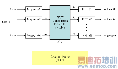 如下图5所示是通过下行预编码支持FEXT Cancellation的系统参考模型[8],其中FEXT Cancellation预编码放在星座映射图和IFFT模块之间。