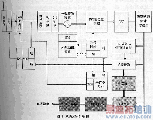 系统设计的输入中频信号,直接对中频信号进行亚采样。系统分为前FFT同步、FFT、后FF向步与TPS解调、信道均衡与校正、信道解码五个模块。如图1所示。经过前FFT同步模块,数据被变换为速率为9.14MS/s的复数基带信号,同时去掉保护间隔;经FFT变换后数据被变换到领域;后FFT同步模块在频域中完成整数频偏的估计与校正、精符号偏移与采样率偏移的估计、TPS解调与导频提取;然后信道估计与均衡模块利用撮的导频进行CPE估计与校正、信道估计与均衡;接下来在信道解码模块中完成星座解映射、解符号交织、解化特交织、Viterbi译码、解卷积交织、RS译码、解能量扩散,最后输出TS流数据。