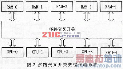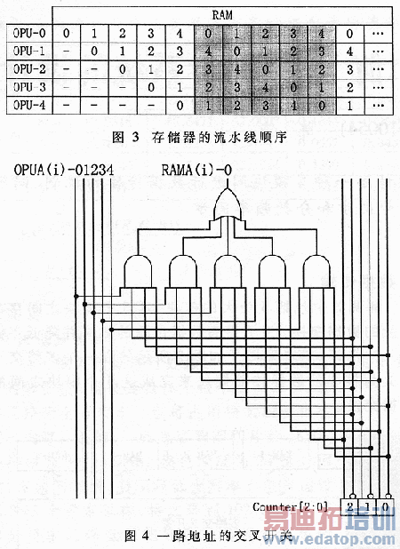 OPU-I表示5个模块,称为运算单元,而RAM-I表示5个RAM块,5个模块单元以流水线的方式交替使用这5个RAM块,流水线节拍如图3所示。OPU-0主要完成基带变换,,FFT前同步;OPU-1主要完成FFT变换;OPU-2主要完成FFT后同步;OPU-3主要完成信道仪态坏蛋均衡;OPU-4主要完成信道解码。其中一路地址的交叉开关如图4所示。