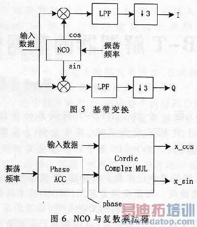 本系统设计的中频输入频率为36.5714MHz,亚采样速率为:27.42855MHz,设ω0=9.14285MHz,低通滤波器的通带归一化截止频率为0.277488966788,阻带归一化截止频率为0.3891776888786。通带内平坦度要求小于0.002dB,阻带抑制要求大小60dB,这个低通滤波器用一个74阶的FIR低通滤波器实现。基带变换模块结构如图5,其中NCO为数控振荡器,与一个复数乘法器一起完成基带变换、IQ分离和分数频偏极校正的功能,结构如图6所示。