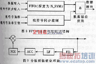 粗符号同步和分频频偏采用基于TGI的联合估计算法,它利用TGI相关进行同步估计。具体算法参见参考文献,实现结构如图7所示。其中N_FFT=2048;N_TGI是保护间隔的长度,可以为N_FFT的1/32、1/16、1/8、1/4四个值。