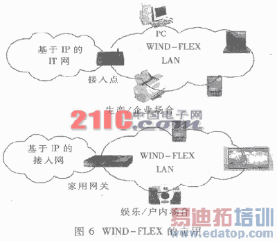 WIND-FLEX作为下一代无线网络的一个有高附加值的解决方案被提出,迎合了WPAN和WLAN应用(包括家庭和企业环境)的性能需要。值得注意的是,就将来的家庭网络方案而言,一个单集方式(即用单一的无线分布点覆盖整个家庭范围)难以适应当前的多媒体应用的需要。单集方式实际上以很低的每用户有效负荷率为特征,在不同的建筑或其它单终端用户场合缺乏灵活性。因此,WIND-FLEX使用了多集方式,每单集都覆盖一个有限的范围,且被赋予特定的功能和需求(娱乐、生产、自动化和控制等),尽可能最小化安装和使用的时间、复杂度和开销。另一方面,在企业范围,除了弥补有线和无线方案的差异外,就连接速率而言,对安全性、移动性、容易的资源接入和信息交换(如会议)的强烈需求,推动了这种具有高性能、内在的安全性和灵活性的无线接入方案的发展。两个典型的WIND-FLEX应用场合如图6所示。