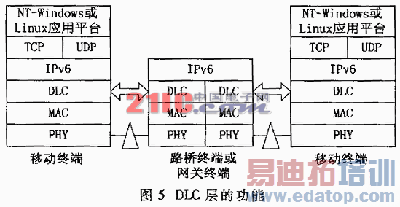 对WIND-FLEX DLC的一个特别的要求是能快速和动态地自适应物理层链接的变化。DLC协议的向上接口为网络层提供服务, WIND-FLEX将其视为网络协议(IPv4或IPv6)。DLC通过WIND-FLEX空中接口,提供传输IP数据报到同等网络协议实体的功能(如图5),并针对不同的QoS需求,将IP数据报映射成不同层次的服务。两个DLC实体间的数据交换总是面向连接的。