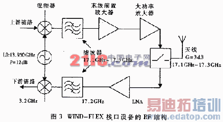 OFDM能较好地压制相位噪声,且在高阶星座(如64QAM)具有稳定的频率特性,是WIND-FLEX系统的一项重要技术。基于低设计成本的RF结构(如图3)和IF结构能获得较低的相位噪声和极高的频率稳定性。就滤波器而言,宽信道带宽(即50MHz)并不一定要求昂贵的元件(如SAW或陶瓷滤波器),基于微带或离散设备的低成本滤波器也能在这个设计中使用。