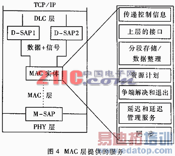 MAC层提供的服务可概括为(如图4):(1)发送和接收;(2)上层的接口;(3)分段存贮和数据管理;(4)长期调度(MAC以上层);(5)短期调度(MAC以下层);(6)同步;(7)时延;(8)时延站管理;(9)争端解决和退出;(10)长期调度所需控制信息的传递;(11)短期信息所需控制信息的传递;(12)子帧间的通信。