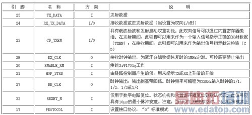 无线电接口允许通过一个外部线路与发射和接收蓝牙无线电信号的天线连接;可以使用外部发射/接收转换和功率放大器的控制信号;需要外部阻抗匹配和不平衡变压器回路完成接到天线的接口。信号描述如表1所列。