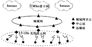 3.5GHz无线接入作为接入网解决方案,通过城域网接入移动IP骨干网(即CMNet),为用户提供Internet接入、VPN、集团IP电话、IP增值、LAN互连、会议电视等业务。其系统模型如图1所示。