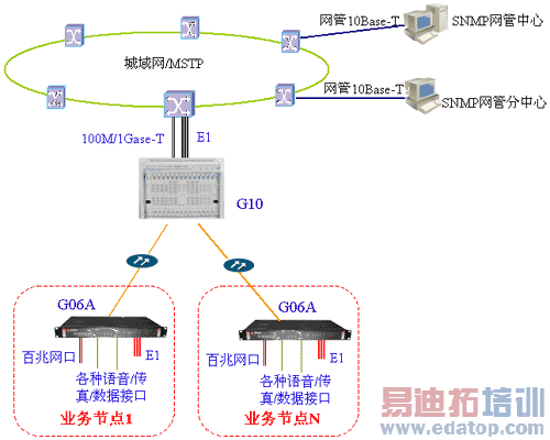 对运营商而言,用户的100M以太网和E1业务可在上级G10汇接点直接接入MSTP城域网,其他语音、数据业务可在汇接点接入相应程控交换机或其他设备,也可通过G10汇聚到E1中接入MSTP城域网传输,整个接入网与MSTP城域网紧密连接,浑如一体。