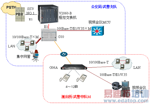 如上图所示,采用“三合一”的iPDH设备进行星形组网,一次性提供几乎所有需要的业务(电话、100M网络、视频会议接口等) ,充分满足公安、武警专网中电话、数据、视频三网合一的要求,组网简洁明了,较少故障点,网络可靠性、稳定性得到提高。所有下属节点业务传输到中心点后,G10出对应的业务接口连接到相应设备,电话接口可直接出E1接口通过V2060-B程控用户交换机转换为标准的SS7、PRI、NO.1数字信令后连入局端程控交换机,再由局端程控交换机完成与PSTN的连接。对于公安局/武警支队的程控交换机,如不希望增加V2060-B设备,也可由G10直接出模拟二线环路中继与程控交换机连接。